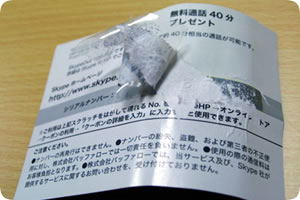 この券はSkypeOutのシリアルナンバーがスクラッチになっていて、そのスクラッチを剥がし、そこに現れたナンバーを入力することによってクレジットが課金されます。